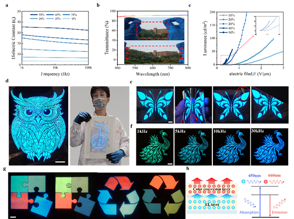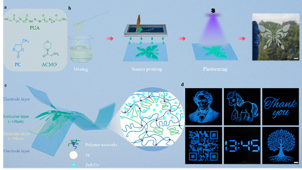 柔性交流电致发光(ACEL)器件因其兼具发光与柔性特性,被广泛认为是可穿戴电子、智能交互和软体机器人等领域的重要候选技术。但长期以来,如何在保持器件透明性和图案精细度的同时降低驱动电压,一直是制约该领域发展的难题。本研究通过将小分子高介电组分均匀引入聚合物基体,制备出一种具有高介电常数(可达25)和高透过率(90%)的透明油墨。在此基础上,利用丝网印刷成功制备了高分辨率图案化电致发光器件,最低驱动电场仅需0.33 V/μm,达到了目前报道的最低值。同时,该油墨体系具备良好的流变特性,支持复杂图案和大面积制备,表现出良好的产业化潜力。