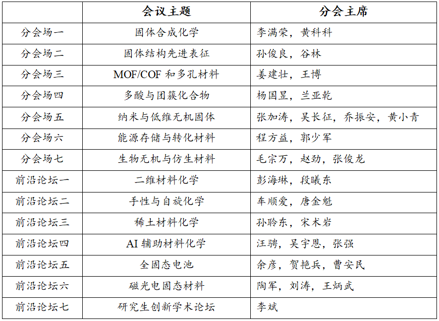 本届会议围绕会议主题设置了形式多样的成果交流方式,设立了由固体合成化学、固体结构先进表征、MOF/COF和多孔材料、多酸与团簇化合物、纳米与低维无机固体、能源存储与转化材料、生物无机与仿生材料组成的七个分会;设立了二维材料化学、手性与自旋化学、稀土材料化学、AI辅助材料化学、全固态电池、磁光电固态材料、研究生创新学术论坛七个前沿论坛。成果展示采取大会报告、主题报告、邀请报告、口头报告和墙报展示等模式。此外,还安排了学术期刊、学术机构和相关企业的仪器、产品展览。